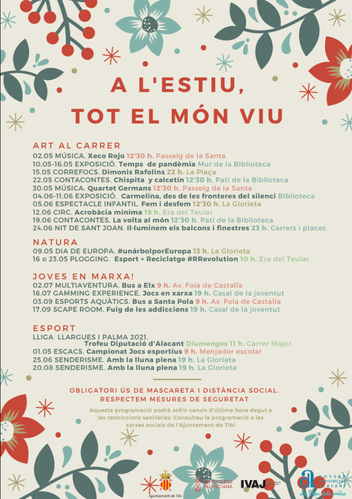 Desde el Ayuntamiento de Tibi se ha presentado el Programa de actividades “A l’estiu tot el món viu!”. Podemos encontramos actividades relacionadas con la naturaleza, el arte, el deporte y las actividades para los jóvenes. Se trata de un programa especial para estos tiempos, con actividades al aire libre para seguir disfrutando de la vida en compañía y con seguridad.